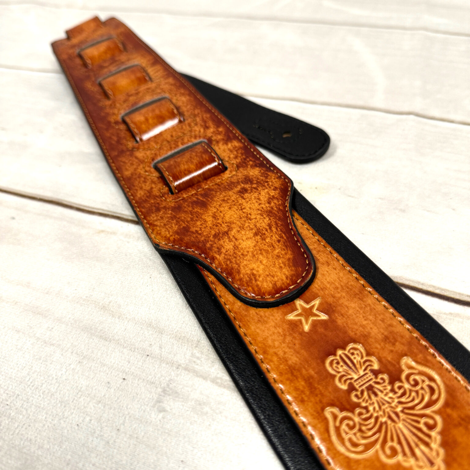 4 Published October 1, 2024 at 2048 × 2048 in GB-23 Latigo Tan Padded Leather Strap with Fleur De Lis & French Chain Design ← Previous Next →