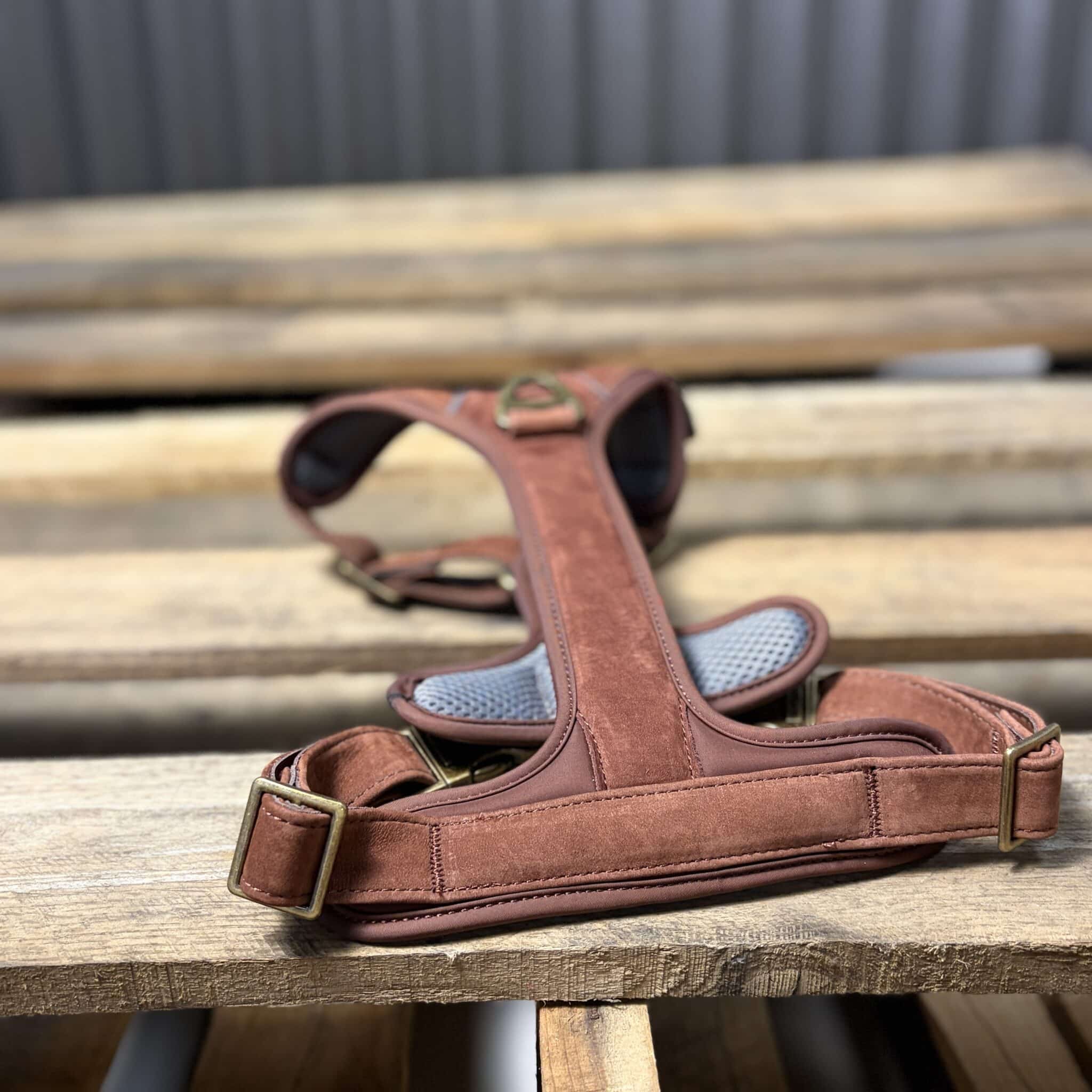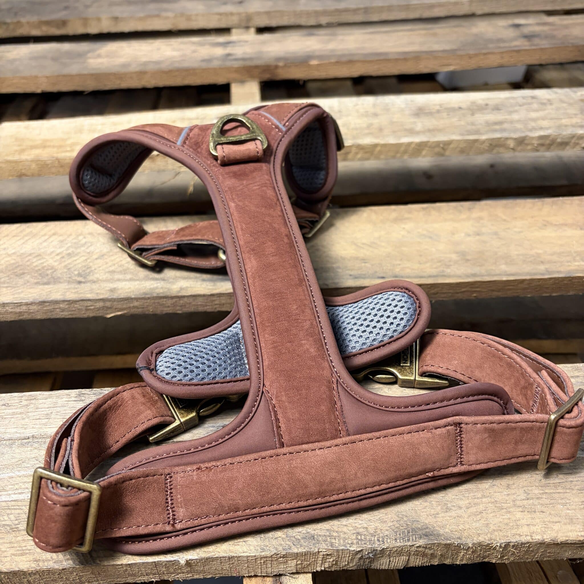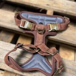 Ol’ Henry’s HS-1001 is a no-pull halter made from the best Nubuck leather. Nubuck is a suede-like leather that is made from the top grain of the cowhide, giving it much more strength than traditional suede made from split hides. The result is an extremely soft, super durable leather. The 1001 halter features soft padded air-mesh to keep your dog comfortable and extra heavy duty brass fittings, including both a front mounted no-pull D-ring as well as a top mounted D-ring for better behaved pooches.