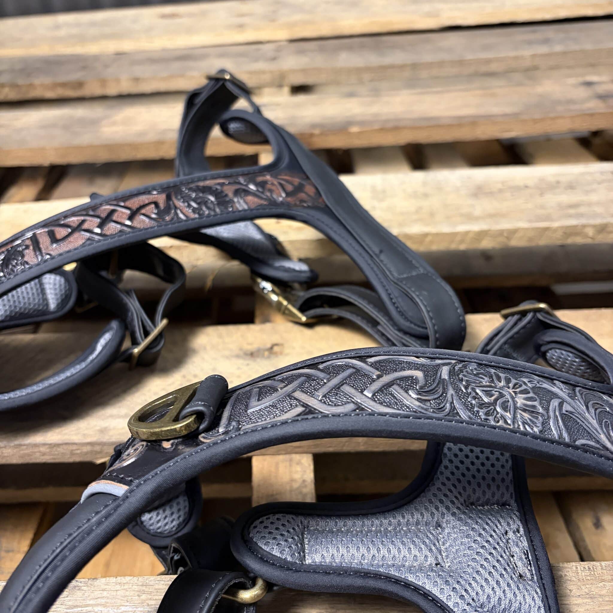 Ol’ Henry’s HS-515 is a halter with Italian cowhide leather front piece 100% carved by hand in this Celtic design, combined with padded air-mesh backing and front mounted heavy brass no-pull D-ring.